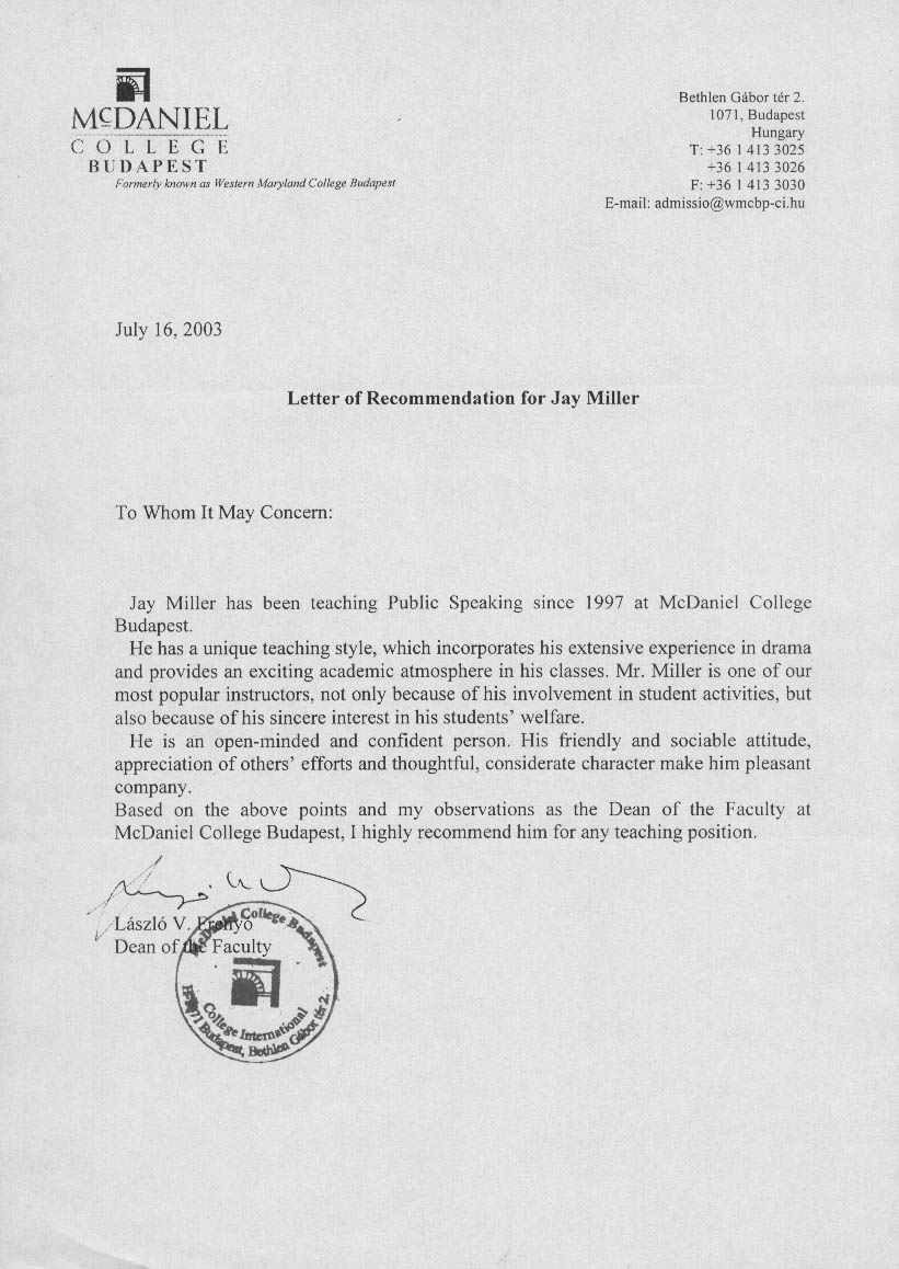 During this time in Budapest, I have been a professor of public speaking at Mc Daniel College and in 2003; I began teaching journalism, job